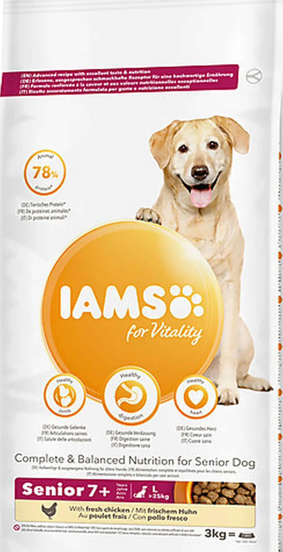 IAMS for Vitality pour chiens seniors est une recette haut de gamme, complète, équilibrée et pensée pour la santé de votre compagnon. Notre recette savoureuse au poulet frais contient des protéines animales de haute qualité, sélectionnées avec soin pour favoriser les 7 signes de la vitalité de votre compagnon. Avec 78 % de protéines animales (sur la teneur totale en protéines), notre recette permet à votre chien de rester en bonne santé, actif et plein de vie.