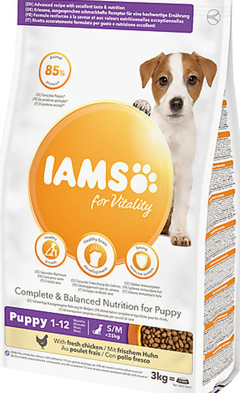 IAMS for Vitality pour chiot est une recette complète et équilibrée conçue par des experts pour la santé de votre animal. Notre recette savoureuse au poulet frais contient des protéines animales de haute qualité, sélectionnées avec soin pour favoriser les 7 signes de vitalité de votre compagnon. Avec 85 % de protéines animales (sur la teneur totale en protéines), notre recette permet à votre chiot de rester en bonne santé, actif et plein de vie. Convient aux races de petite taille et de taille moyenne.