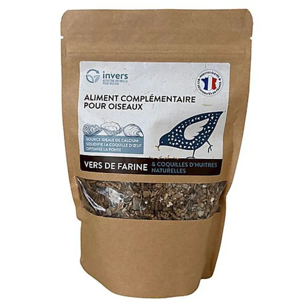 Mélange de vers de farine et de coquilles d’huîtres 400g. Composé de 92% de coquilles d’huîtres et 8% de vers de farine déshydratés (larves de Ténébrion meunier).