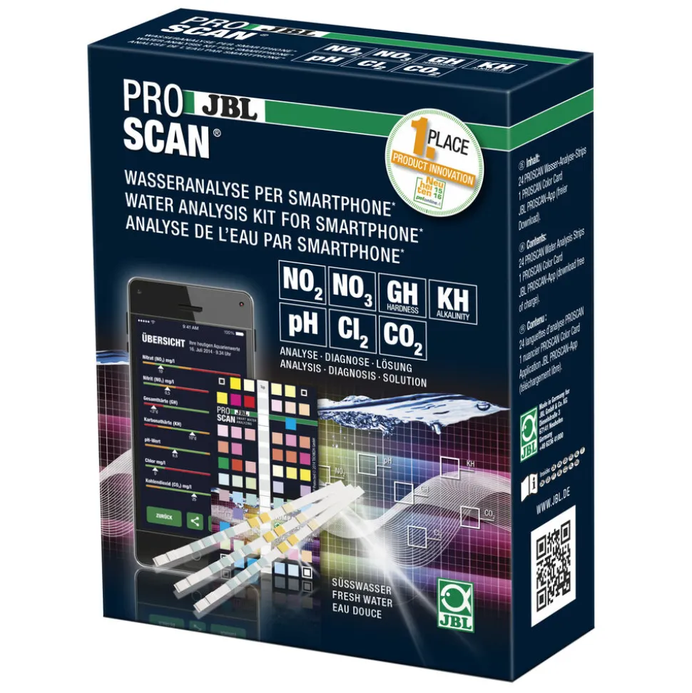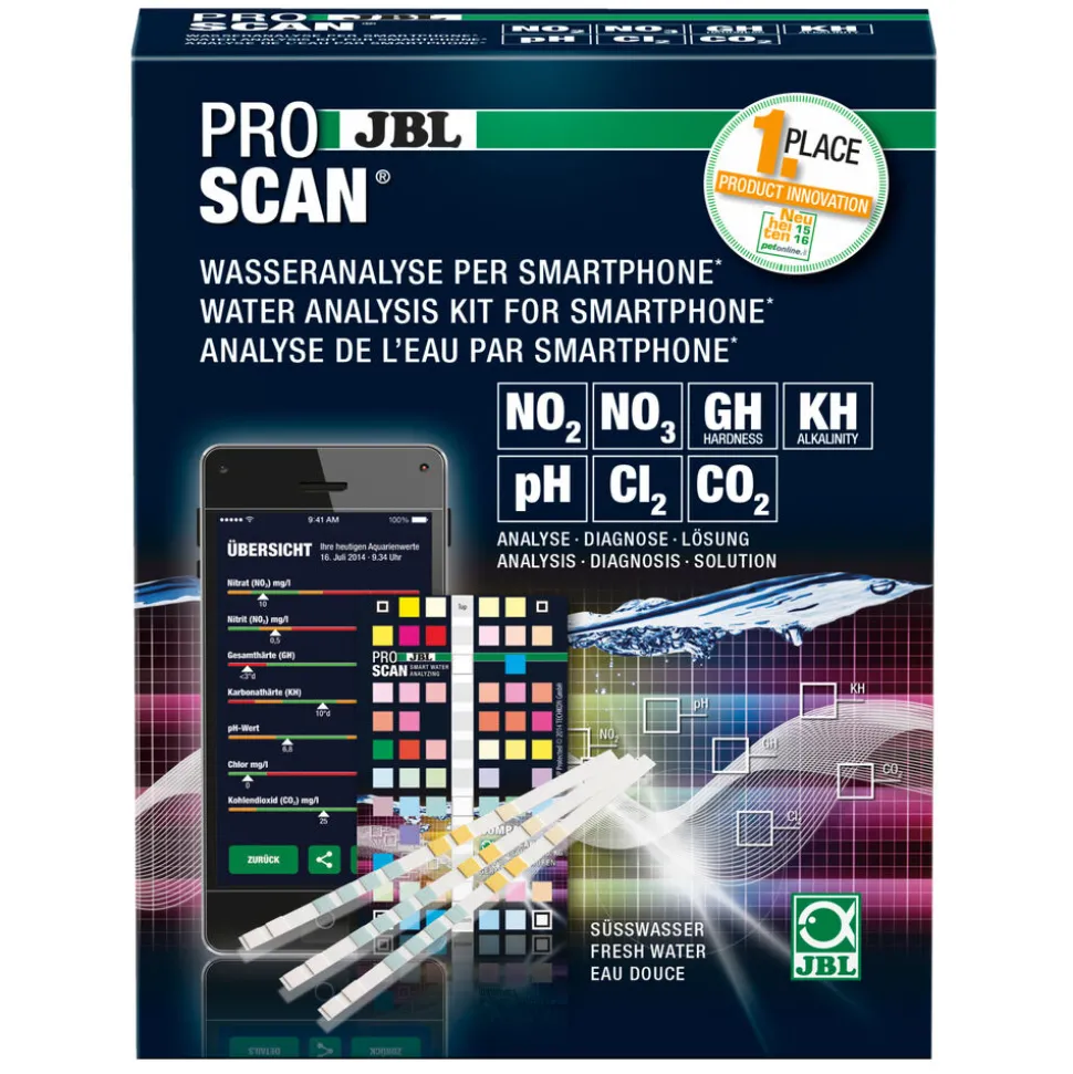 Contient 24 languettes d’analyse (GH, KH, pH, nitrite, nitrate, chlore et calcul du CO?) avec nuancier spécial JBL ProScan. Le nuancier est utilisé comme référence pendant le balayage de la languette d’analyse. Le résultat est analysé et en cas de besoin