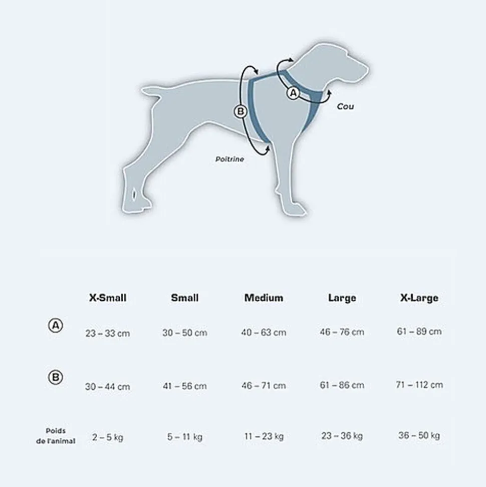 Pour choisir la bonne taille pour votre chien : mesurez l’endroit le plus large de la cage thoracique de l’animal, juste derrière les pattes avant. Si votre animal est entre 2 tailles, choisissez la plus petite.