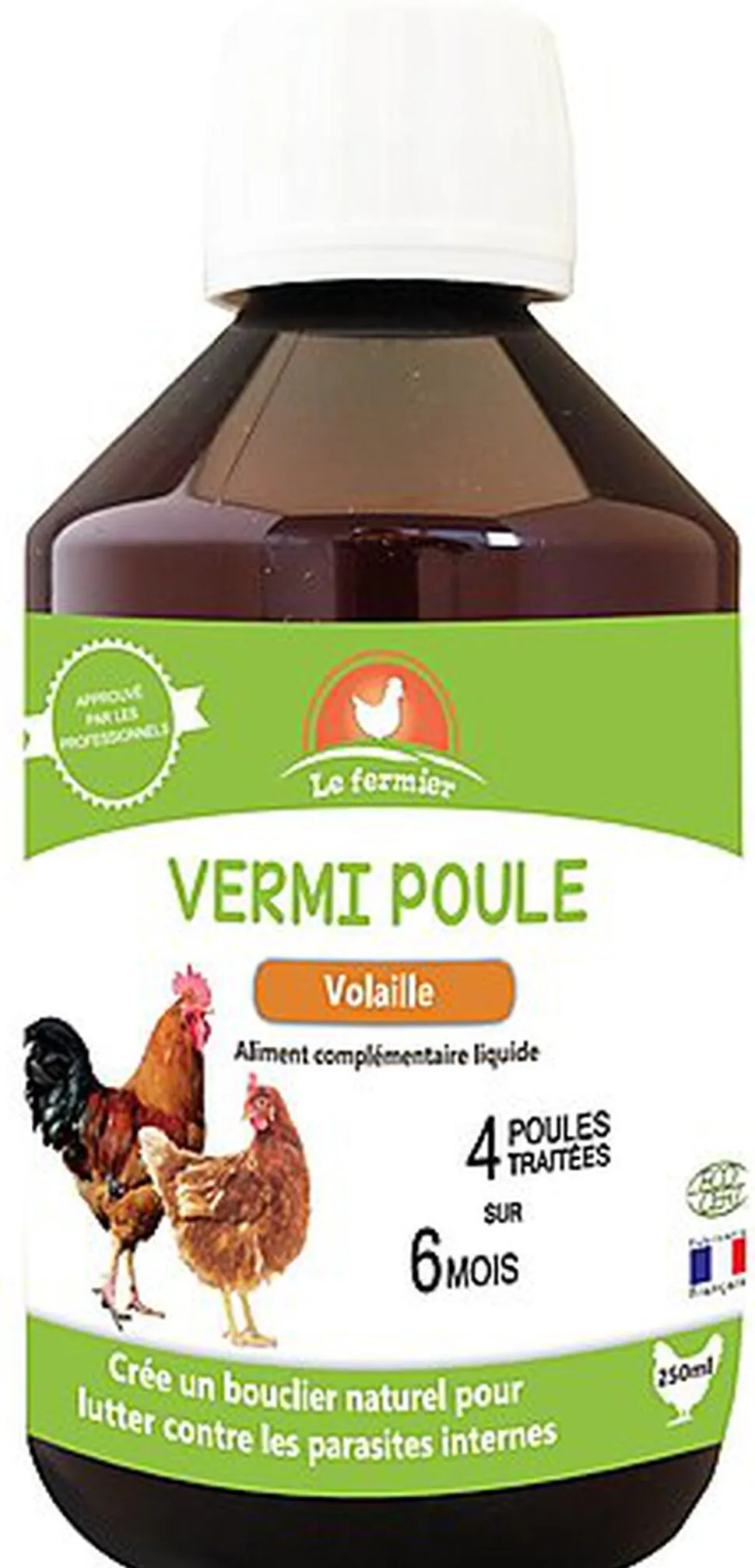 | Conseils d’utilisation | bien agiter avant emploi, 2ml (1 demi-cuillère à café) par poule et par jour à diluer dans un volume d’eau consommé dans la journée., durée d’utilisation : 3 jours, à renouveler chaque mois., info pratique : 1 bouchon du produit = 10 ml, soit une dose journalière pour 5 poules. en moyenne, une poule boit 250 ml d’eau par jour |