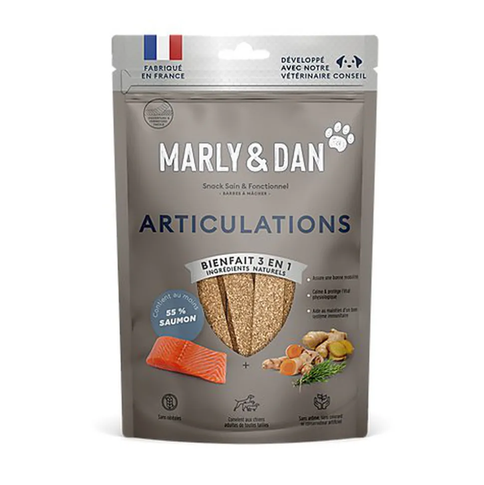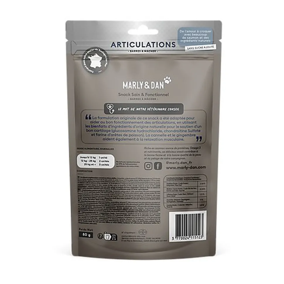 » La formulation originale de ce snack a été adaptée pour aider au bon fonctionnement des articulations, en utilisant les bienfaits d’ingrédients d’origine naturelle pour le soutien d’un bon cartilage (farine d’arêtes de poisson). La cannelle et le gingembre aident également à la relaxation musculaire. «