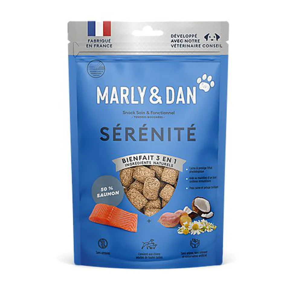 » Ce snack offre un support naturel à la gestion du stress de votre chien grâce aux effets apaisants des ingredients naturels tels que la camomille et la valériane. »