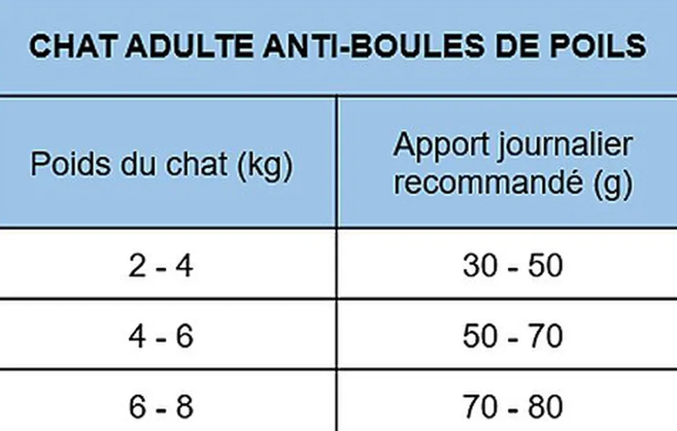 | Directives d’alimentation | La quantité quotidienne peut varier en fonction de la température extérieure, du mode de vie de l’animal (à l’intérieur ou à l’extérieur), du tempérament et de l’activité. Il est recommandé d’effectuer le changement d’un aliment à d’autres aliments de manière progressive pendant une période minimale d’une semaine. Assurez-vous que votre animal ait un accès permanent à de l’eau fraîche. Stockez dans un endroit frais et sec et fermez correctement le contenant après chaque utilisation. La taille et la couleur du produit peuvent varier en fonction des propriétés et caractéristiques des ingrédients.Poids du chat (kg) | Quantité quotidienne recommandée (g)2 – 4 | 30 – 50; 4 – 6 | 50 – 70; 6 – 8 | 70 – 81 |