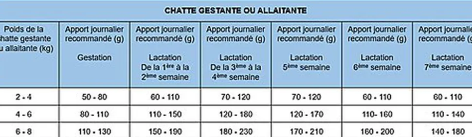 | Directives d’alimentation | La quantité quotidienne peut varier en fonction de la température extérieure, du mode de vie de l’animal (à l’intérieur ou à l’extérieur), du tempérament et de l’activité. Il est recommandé d’effectuer le changement d’un aliment à d’autres aliments de manière progressive pendant une période minimale d’une semaine. Assurez-vous que votre animal ait un accès permanent à de l’eau fraîche. Stockez dans un endroit frais et sec et fermez correctement le contenant après chaque utilisation. La taille et la couleur du produit peuvent varier en fonction des propriétés et caractéristiques des ingrédients. Âge du chaton (kg) | Quantité quotidienne recommandée (g): 4 | 21 – 31; 5 | 24 – 33; 6 | 26 – 35; 7 | 29 – 37; 8 | 31 – 39; 9 | 35 – 42; 10 | 39 – 44; 11 | 42 – 47; 12 | 44 – 49. Poids de la chatte gestante ou allaitante (kg) | Quantité quotidienne recommandée (g) 2 – 4 | 50 – 80 (Gestation), 60 – 110 (Allaitement : Première à deuxième semaine), 70 – 120 (Allaitement : Troisième à quatrième semaine), 70 – 120 (Allaitement : Cinquième semaine), 60 – 110 (Allaitement : Sixième semaine), 60 – 110 (Allaitement : Septième semaine) 4 – 6 | 80 – 110 (Gestation), 110 – 150 (Allaitement : Première à deuxième semaine), 120 – 180 (Allaitement : Troisième à quatrième semaine), 120 – 170 (Allaitement : Cinquième semaine), 110 – 160 (Allaitement : Sixième semaine), 100 – 140 (Allaitement : Septième semaine) 6 – 8 | 110 – 130 (Gestation), 150 – 190 (Allaitement : Première à deuxième semaine), 180 – 230 (Allaitement : Troisième à quatrième semaine), 170 – 210 (Allaitement : Cinquième semaine), 160 – 200 (Allaitement : Sixième semaine), 140 – 180 (Allaitement : Septième semaine) |