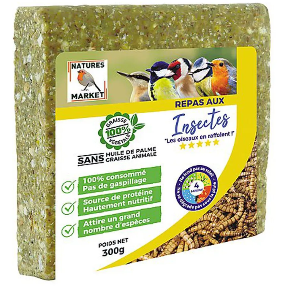 Bloc de 300 gr de graisse végétale sans huile de palme aux insectes, les oiseaux picorent sur place au lieu d’emmener la nourriture au loin , ce qui permet de les observer plus longtemps.