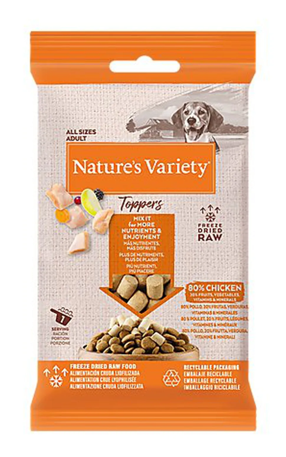| Composition | Poulet* (80 %) (viande de poulet désossée 40 %, coeur de poulet 30 %, foie de poulet 10 %), carotte* (5 %), pomme* (5 %), fibre de pois* (1,25%), courge butternut* (1 %), patate douce* (1 %), substances minérales (1 %), canneberges* (0,5 %), mûres* (0,5 %), graine de lin*, racine de chicorée*, chou kale*, menthe poivrée*, huile de noix de coco*, pulpe de betterave*, thé vert*, yucca, romarin*, persil*, racine de pissenlit*, feuille d’aubépine*. *Ingrédients naturels. |