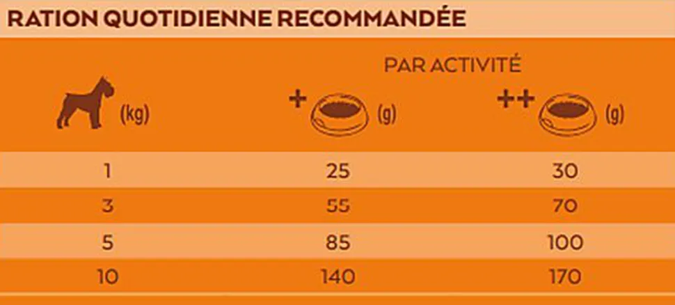 | Constituants analytiques | Humidité 8,0 % Protéines 29,0 % Matières grasses 17,0 % Fibres 4,0 % Cendres 8,0 % Calcium* 1,7 % Phosphore* 1,0 % Oméga-6* 2,8 % Oméga-3* 0,3 % Taurine** 1 200 mg/kg Énergie métabolisable* 3 785 kcal/kg |