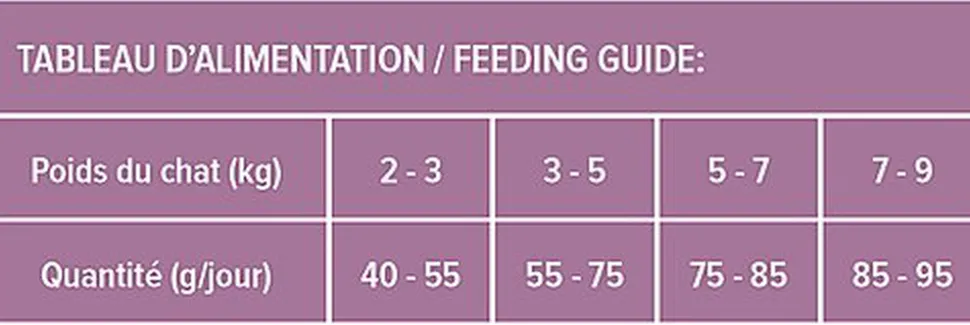 | Directives d’alimentation | Servir l‘aliment sec ou légèrement humidifié avec de l’eau tiède. Veillez à toujours laisser de l’eau fraîche à disposition de votre chat. Les rations journalières recommandées sont indiquées dans le tableau d‘alimentation. Idéalement, la nourriture doit être laissée en accès libre tout au long de la journée. Si vous proposez cet aliment pour la première fois, mélangez le d’abord en petite quantité avec l’ancien aliment, puis augmentez progressivement la quantité au fil du temps. Ne suralimentez pas votre animal. Conserver dans un endroit frais et sec, à l’abri de la lumière. À utiliser de préférence avant et numéro de lot: voir sur le sac |