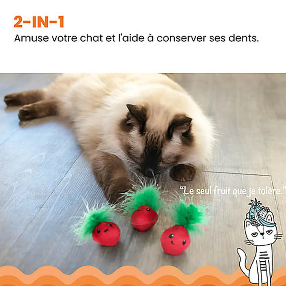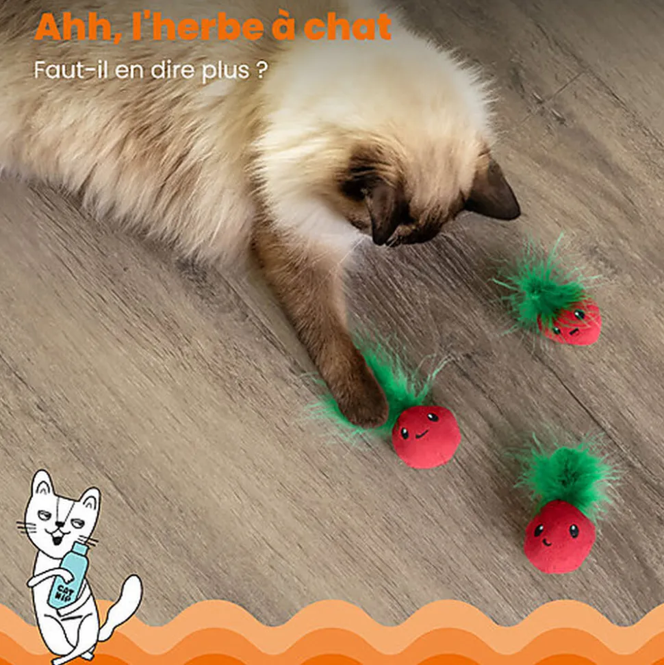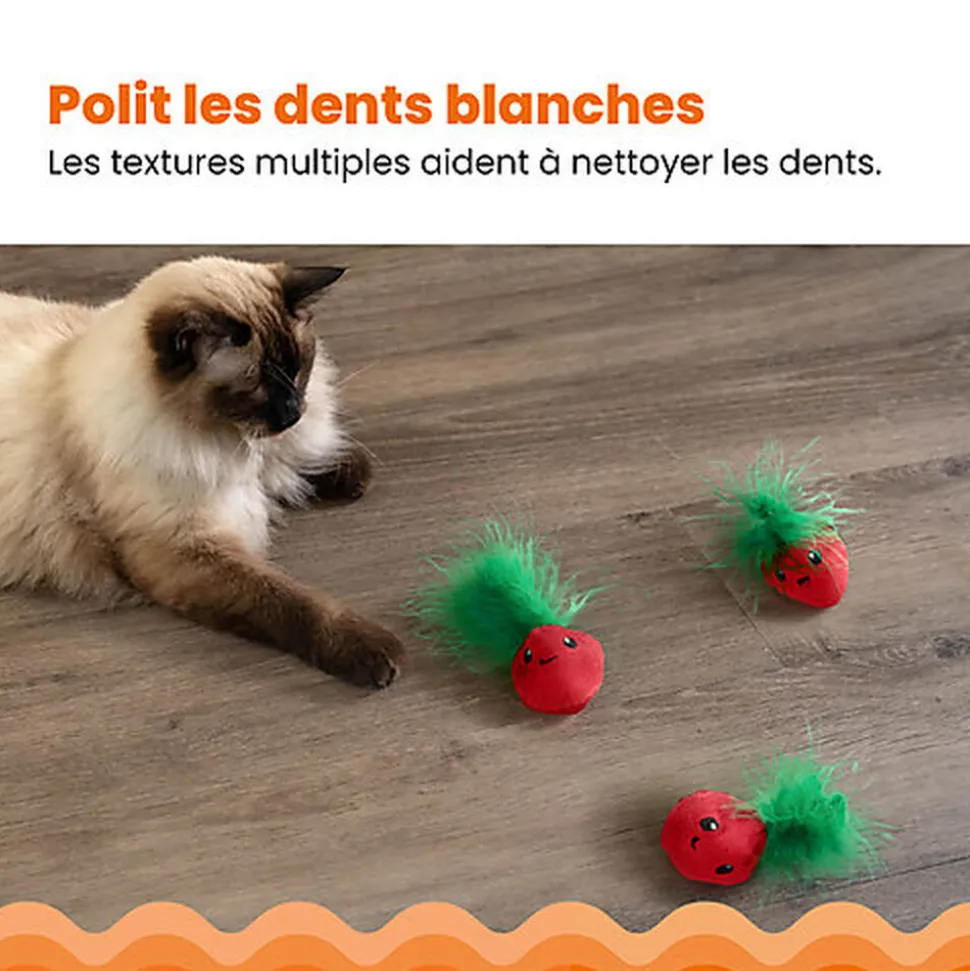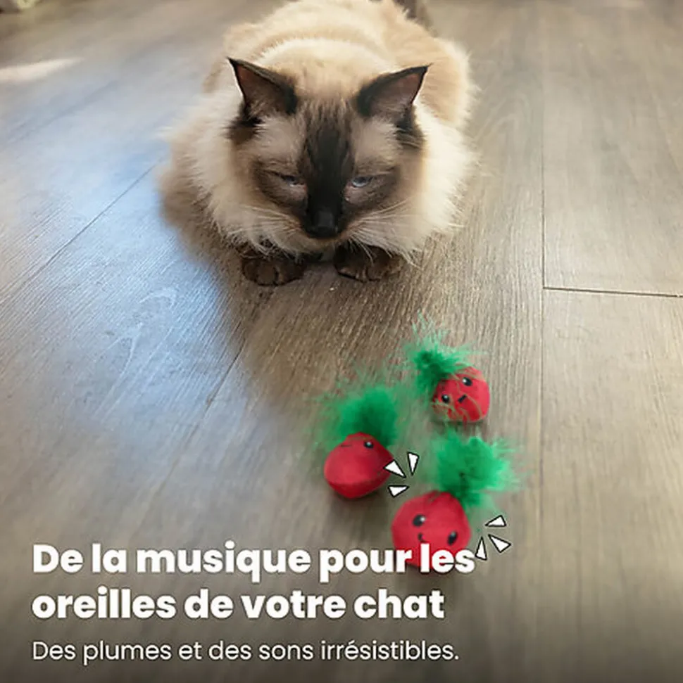 De la taille d’une fraise, ce jouet peut être facilement porté, tapé ou chassé par les chats !