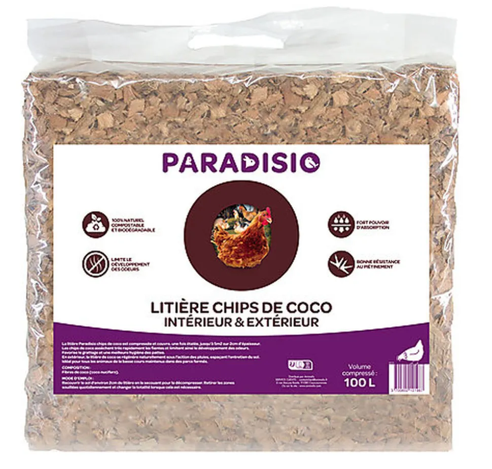 La litière Paradisio chips de coco est compressée et couvre, une fois étalée, jusqu’à 5m² sur 2cm d’épaisseur. Favorise le grattage et une meilleure hygiène des pattes. En extérieur, la litière de coco se régé nère naturellement sous l’action des pluies, espaçant l’entretien du sol. Idéal pour tous les animaux de la basse cour maintenus dans des parcs fermés.