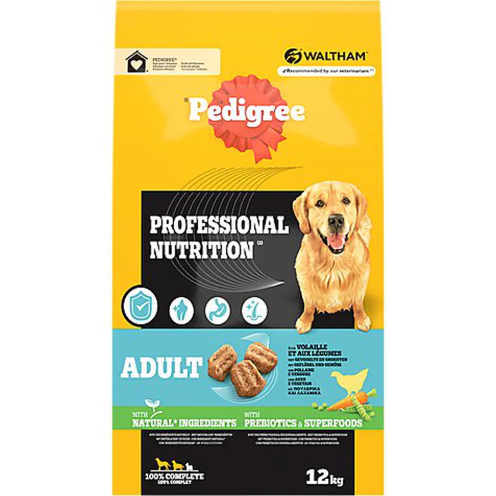 Aliment complet pour chiens adultes – à la Volaille et aux Légumes. Les croquettes Pedigree® – Professional Nutrition Adulte offrent à votre chien un repas 100% complet et équilibré. Avec des ingrédients naturels*, des prebiotiques et superaliments. Pedigree® – Professional Nutrition aide votre chien à rester en bonne santé et plein de vitalité. Formulé avec un profil équilibré d’acides aminés issus de protéines de haute qualité pour maintenir des muscles vigoureux. Formulé avec des niveaux équilibrés de calcium & de phosphore pour des os solides. Elaboré avec du blé complet, source de glucides complexes pour une libération lente de l’énergie. Avec des vitamines B pour vous aider à garder votre chien plein de vitalité et en pleine forme.
