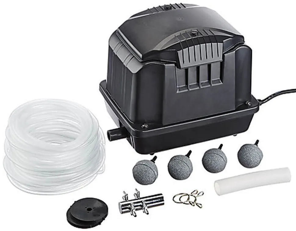 Pontec PondoAir Set 3600 est une pompe d’aération en kit complet pour enrichir de manière fiable l’eau du bassin en oxygène. Le kit convient pour un emploi à l’extérieur et inclut une pompe d’aération silencieuse d’une puissance de 3 600 l/h, un diffuseur d’air, 4 flexibles d’air de 5 m et 4 pierres de diffusion et membranes de rechange.