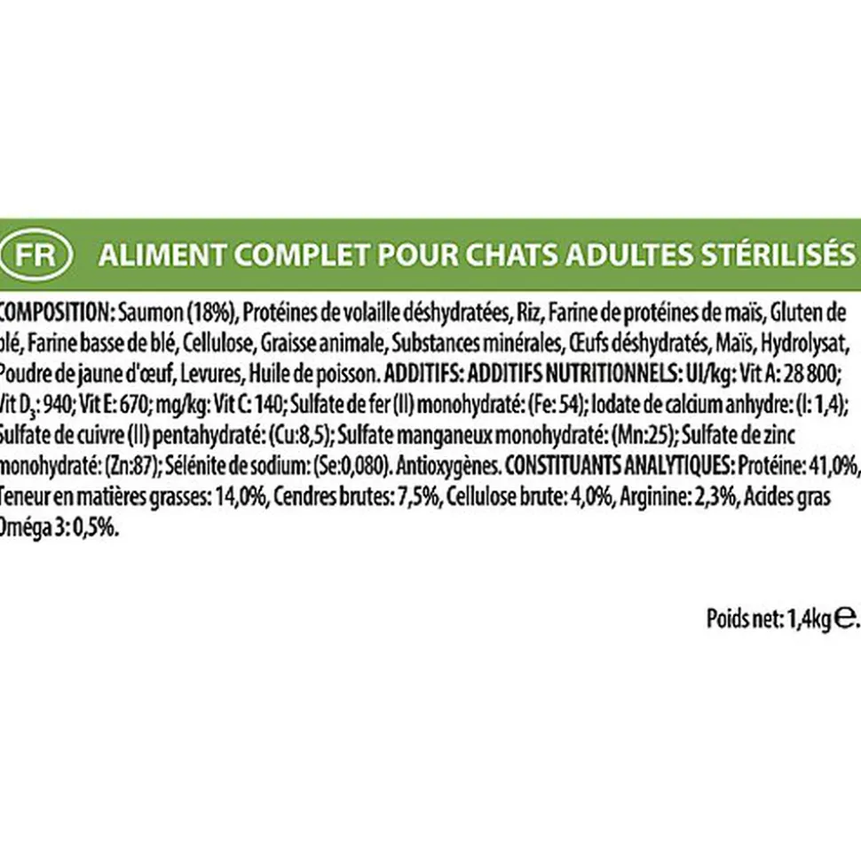 | Composition | Saumon (18%), Protéines de volaille déshydratées, Riz, Farine de protéines de maïs, Gluten de blé, Farine basse de blé, Cellulose, Graisse de porc, Maïs, Substances minérales, Œufs déshydratés, Hydrolysat, Poudre de jaune d’œuf (0,6%), Levures, Huile de poisson. |