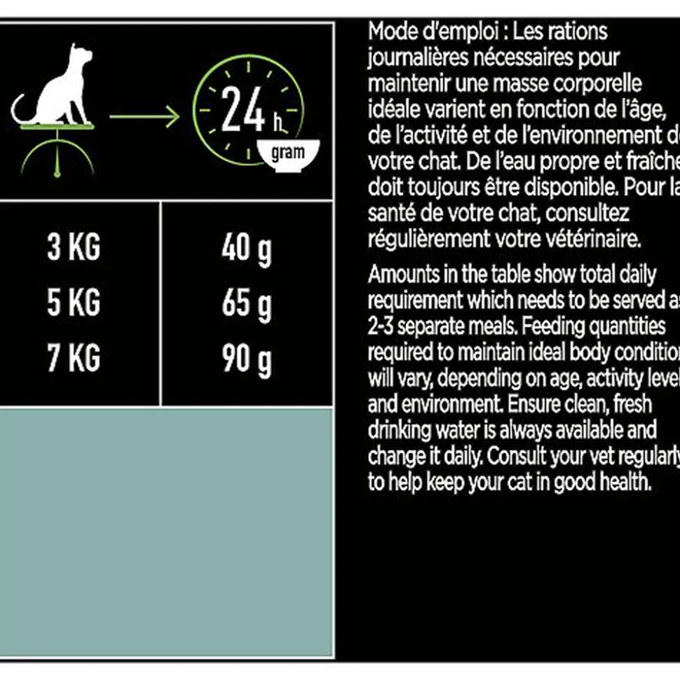 | Directives d’alimentation | Les quantités indiquées représentent la ration journalière totale, qui doit idéalement être mise à disposition de votre chat tout au long de la journée. Les rations journalières nécessaires pour maintenir une masse corporelle idéale varient en fonction de l’âge, de l’activité et de l’environnement de votre chat. De l’eau propre et fraîche doit toujours être disponible. Pour la santé de votre chat, consultez régulièrement votre vétérinaire.Ration journalière recommandée (g/jour) : Poids du chat 3kg 40 5kg 65 7kg 90 Pour une efficacité optimale et durable : à utiliser chaque jour et à conserver dans un endroit frais et sec (inférieur à 32°C). |