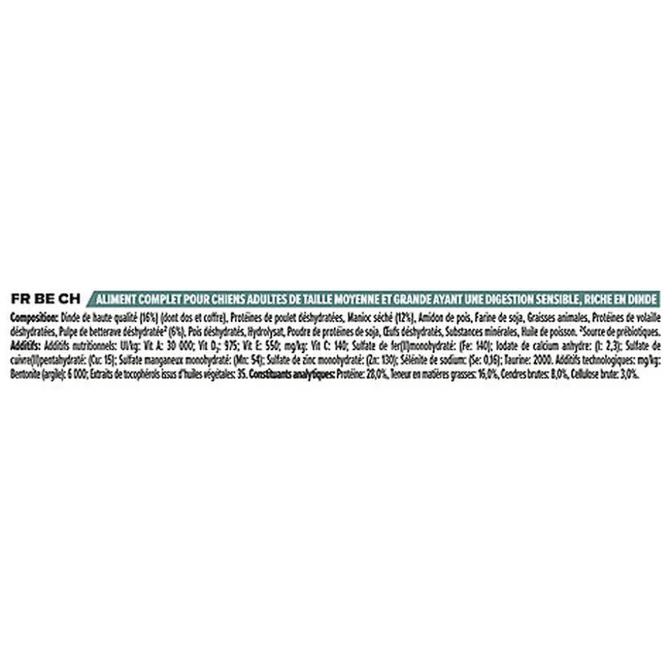 | Composition | Dinde (16%), Protéines de poulet déshydratées, Amidon de pois, Manioc (12%), Pois déshydratés, Graisse animale, Farine de soja, Protéines de pois, Pulpe de betterave déshydratée, Hydrolysat, Œufs déshydratés, Substances minérales, Huile de poisson. |