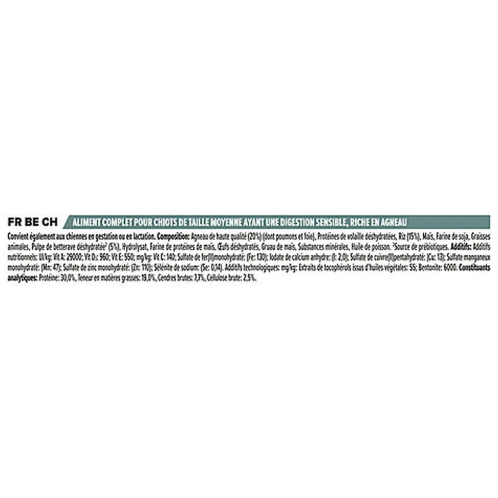 | Composition | Agneau (20%), protéines de volaille déshydratées, maïs, riz (10%), farine de soja, graisse animale, pulpe de betterave déshydratée, hydrolysat, gluten de maïs, oeufs déshydratés, gruaux de maïs, sels minéraux, huile de poisson, colostrum déshydraté (0,1%) |