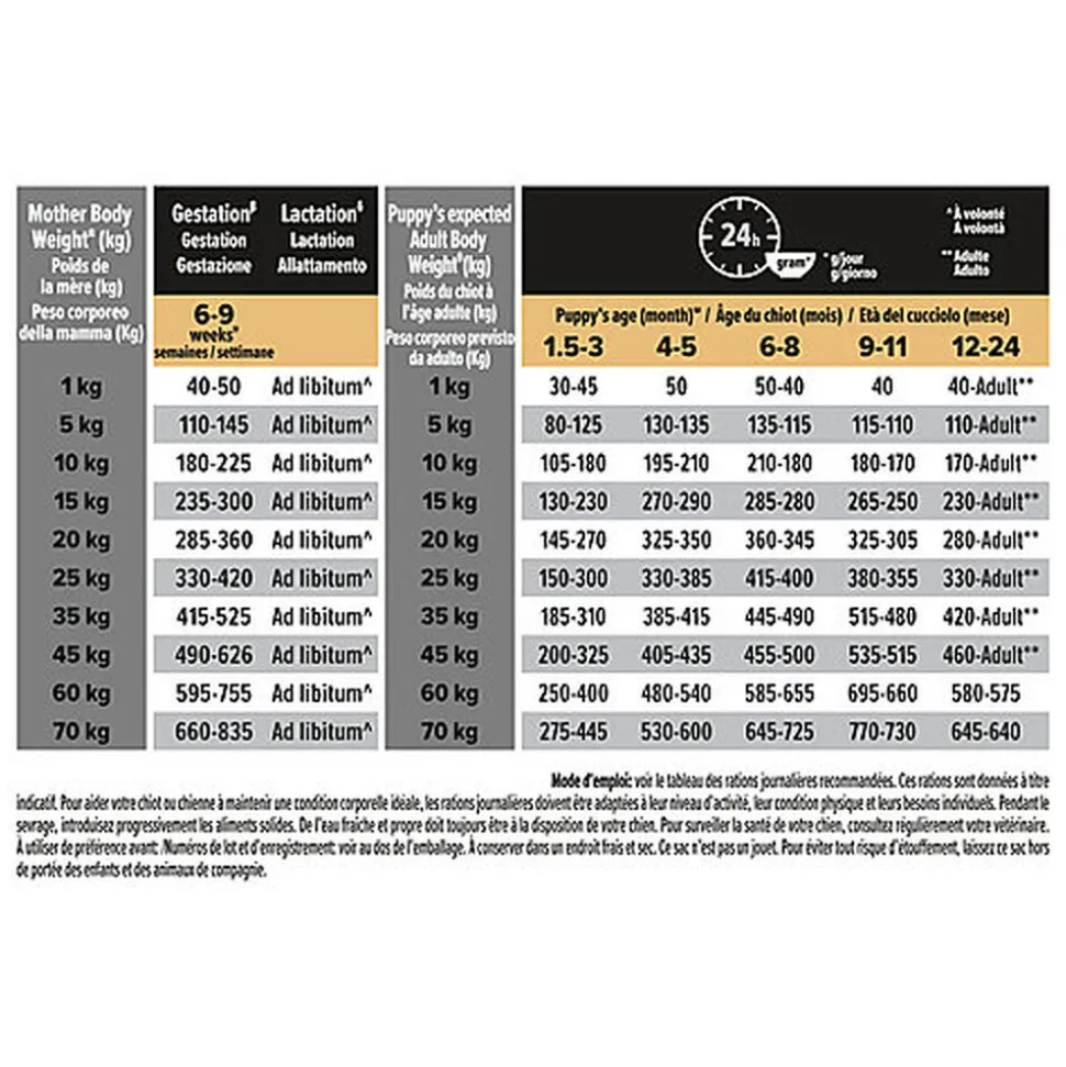 | Directives d’alimentation | Voir le tableau des rations journalières recommandées sur sac. Ces rations sont données à titre indicatif |