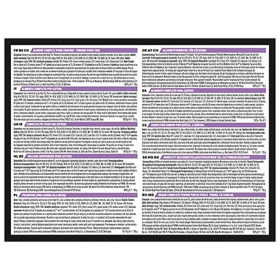 | Directives d’alimentation | Mode d’emploi : Pour les chatons de 6 à 12 semaines, donnez 31/2 à 41/2 sachets tout au long de la journée; de 12 à 26 semaines, 41/2 à 5 sachets/jour et de 26 à 52 semaines, 4 sachets/jour répartis de préférence en au moins 2 repas. Chaque chaton est différent, les rations journalières recommandées et la durée des repas doivent donc être ajustées selon son niveau d’activité et sa condition physique. Pour les chattes en gestation ou en lactation : servir à volonté avec au minimum 4 sachets pour la gestation et 6 sachets pour la lactation. Servir à température ambiante. De l’eau propre et fraîche doit toujours être disponible. |