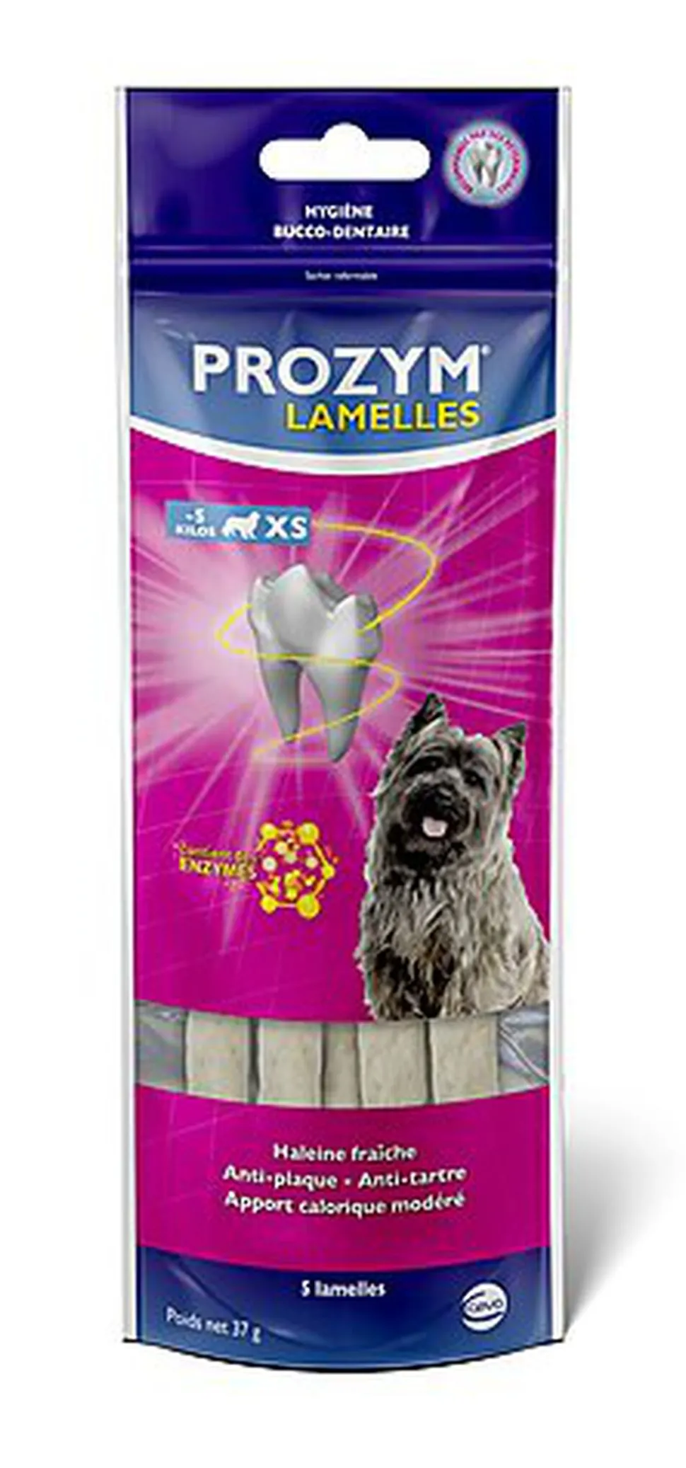 Recommandées par les vétérinaires en prévention ou après un soin dentaire, les lamelles à mâcher PROZYM sont de minces lamelles appétentes adaptées à la dentition des chiens.La taille XS est disponible sous forme cylindrique pour faciliter dans la prise en gueule chez les chiens minis ou toys et sont également recommandées pour les chiens de race brachycéphale (carlin, bouledogue…)