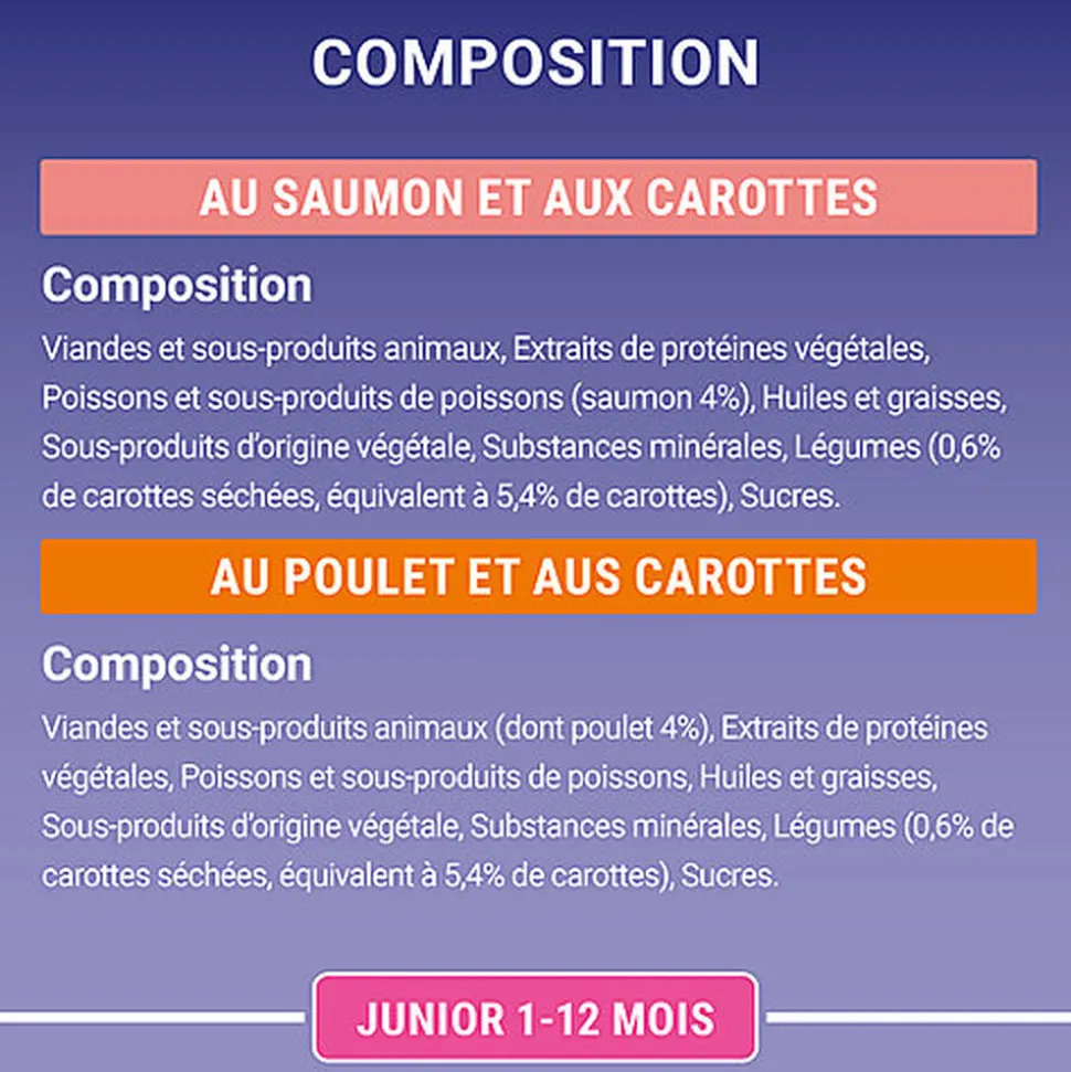 | Composition | Composition :Saumon : Viandes et sous-produits animaux, Extraits de protéines végétales, Poissons et sous-produits de poissons (saumon 4%), Huiles et graisses, Substances minérales, Sous-produits d’origine végétale, Légumes (0,6 % de carottes séchées, équivalent à 5,4 % de carottes), Sucres.Poulet : Viandes et sous-produits animaux (dont poulet 4%), Extraits de protéines végétales, Poissons et sous-produits de poissons, Huiles et graisses, Substances minérales, Légumes (0,6% de carottes séchées, équivalent à 5,4% de carottes), Sous-produits d’origine végétale, Sucres. |
