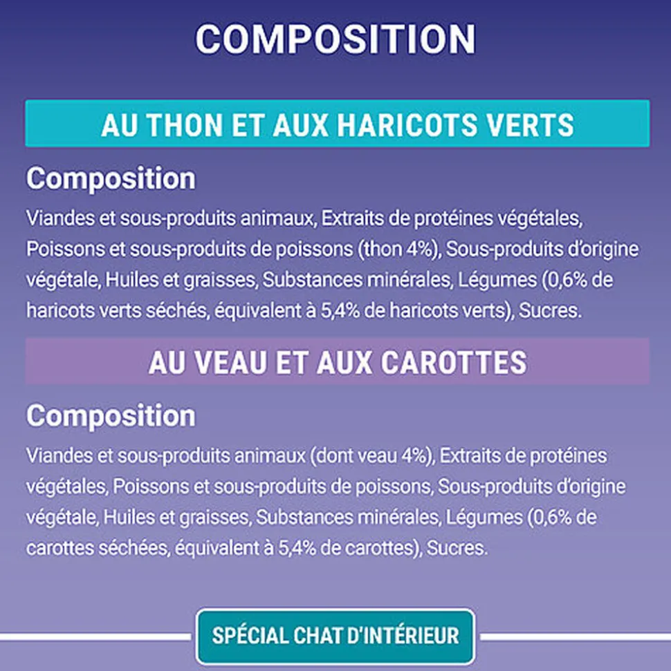 | Composition | Composition: VEAU : Viandes et sous-produits animaux (dont veau 4%), Extraits de protéines végétales, Poissons et sous-produits de poissons, Sous-produits d’origine végétale, Huiles et graisses, Substances minérales, Légumes (0,6% de carottes séchées, équivalent à 5,4% de carottes), Sucres.Thon : Composition: Viandes et sous-produits animaux, Extraits de protéines végétales, Poissons et sous-produits de poissons (thon 4%), Sous-produits d’origine végétale, Huiles et graisses, Substances minérales, Légumes (0,6% de haricots verts séchés, équivalent à 5,4% de haricots verts), Sucres. |