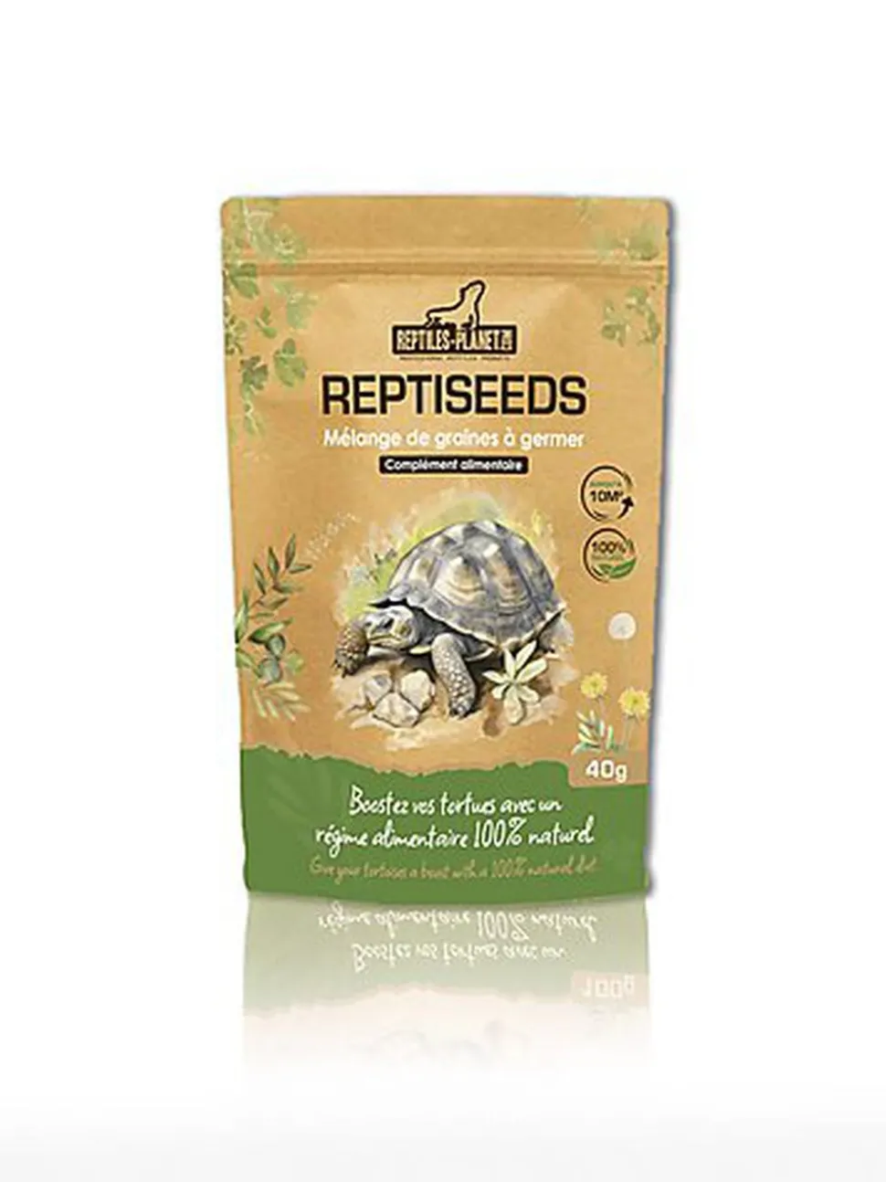 Idéal pour toutes les tortues terrestres méditerranéennes ou exotiques. Mélange permettant la création d’une véritable prairie spécifique à l’alimentation des tortues (Riche en fibres, en vitamines et en minéraux).Paquet de 40 g à jeter dans le jardin ou à semer dans le terrarium ou dans Repti Serre.