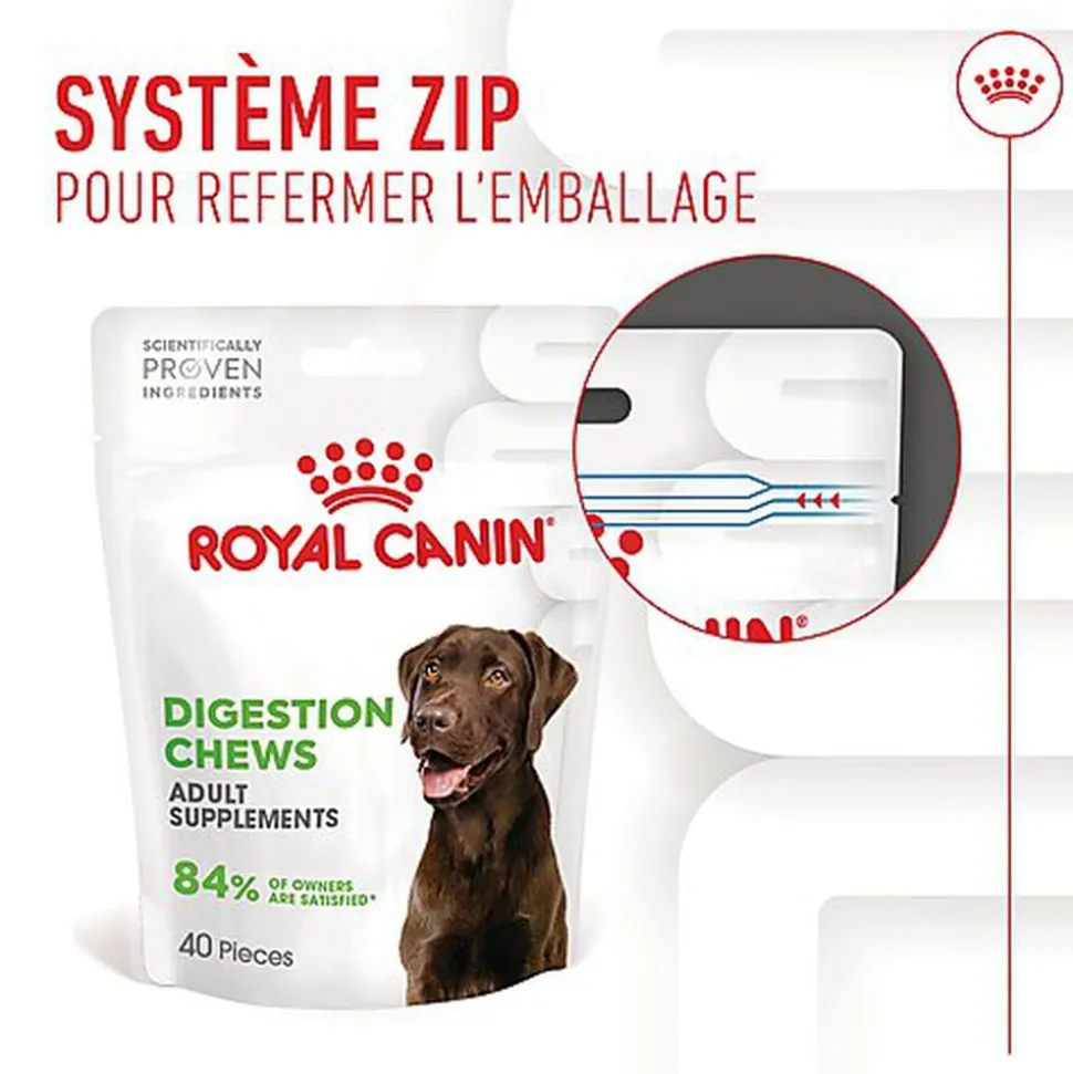 Convenant aux chiens adultes, les suppléments ROYAL CANIN® DIGESTION CHEWS ADULT SUPPLEMENTS sont conçus par des vétérinaires et approuvés par les chiens. Ces suppléments contiennent une combinaison scientifique d’ingrédients, appuyée par plus de 50 ans de recherche et d’observation dans le domaine de la nutrition canine.