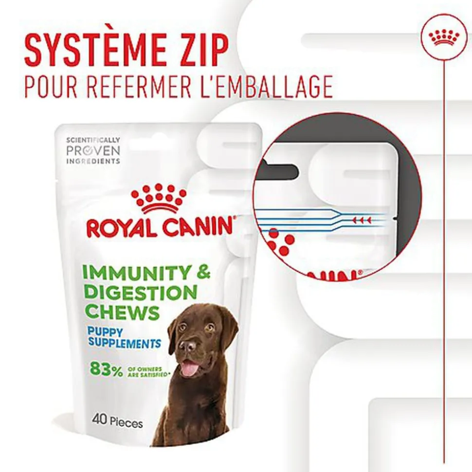Les suppléments ROYAL CANIN® IMMUNITY & DIGESTION CHEWS PUPPY SUPPLEMENTS contiennent des vitamines C et E pour aider à soutenir les défenses naturelles et la santé cellulaire de votre chiot. Ils contiennent également des prébiotiques qui aident à maintenir un équilibre sain des bactéries intestinales, et des bêta-glucanes (postbiotiques) qui favorisent une digestion saine et la qualité des selles.