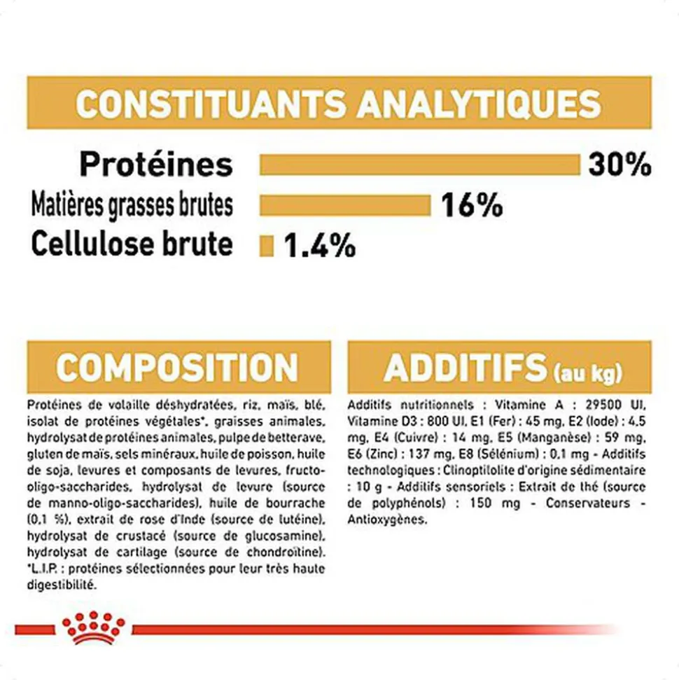 | Constituants analytiques | CONSTITUANTS ANALYTIQUES : Constituants analytiques : Protéine : 30,0 % – Teneur en matières grasses : 16,0 % – Cendres brutes : 6,0 % – Cellulose brute : 1,4 % – Au kg : EPA/DHA : 3 g – Triphosphate pentasodique : 3,5 g. |