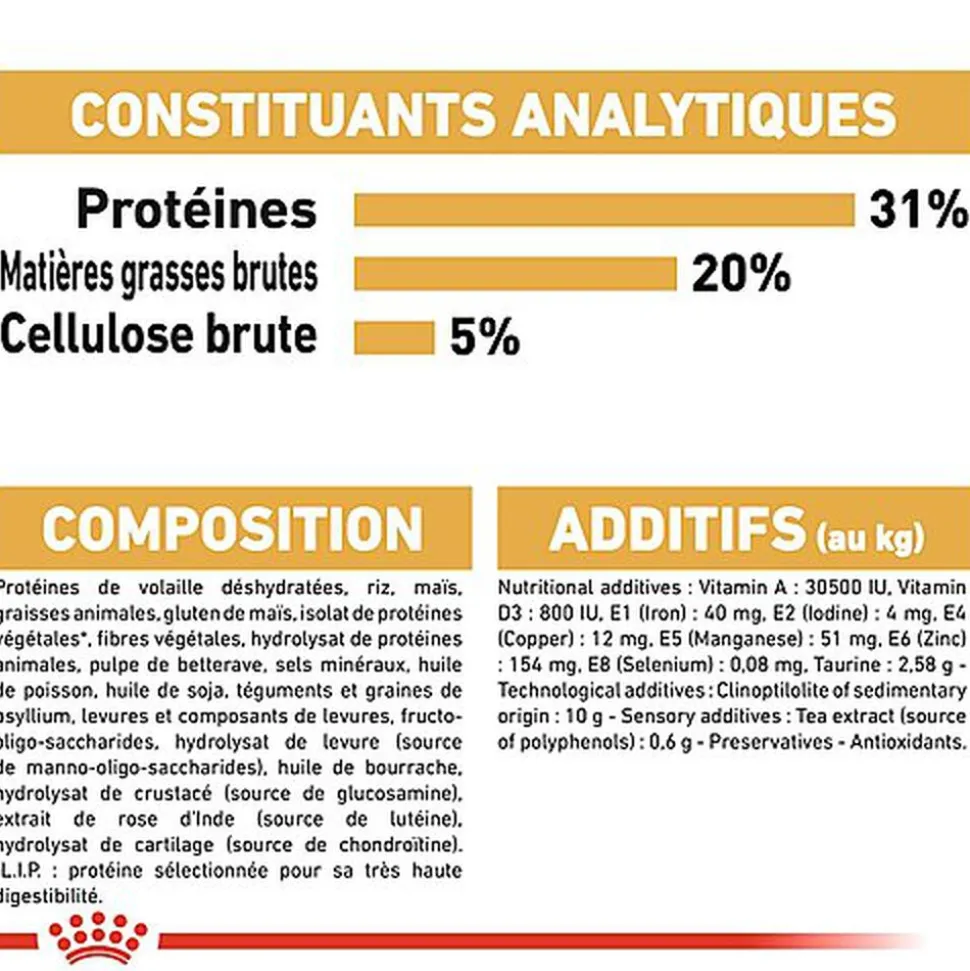 | Composition | COMPOSITIONprotéines de volaille déshydratées, riz, mais, graisses animales, isolat de protéines végétales*, gluten de mais, fibres végétales, hydrolysat de protéines animales, pulpe de betterave, sels minéraux, huile de soja, huile de poisson, téguments et graines de psyllium, fructo-oligosaccharides, hydrolysat de levure (source de manno oligo-saccharides), huile de bourrache, extraits de thé vert (source depolyphénols), hydrolysat de crustacé (source de glucosamine), extrait de rose d’inde (source de lutéine), hydrolysat de cartilage (source de chondroitine).*L.I.P. : Protéines sélectionnées pour leur haute digestibilité.ADDITIFS(au kg)Additifs nutritionnels : Vitamine A: 28000 UI, Vitamine D3: 700 UI, E1 (Fer): 39 mg, E2 (Iode): 3.9 mg, E4 (Cuivre): 5 mg, E5 (Manganèse): 50 mg, E6 (Zinc): 151 mg, E8 (Sélénium): 0.08 mg, Taurine: 3 g – Conservateurs – Antioxygènes. – CONSTITUANTS ANALYTIQUESProtéines: 31% – Matières grasses: 20% – Cendres brutes:7.3% – Cellulose brute: 5.1% – Par kg: Acides gras Oméga 3: 9.7 g dont EPA et DHA: 3.5 g. |