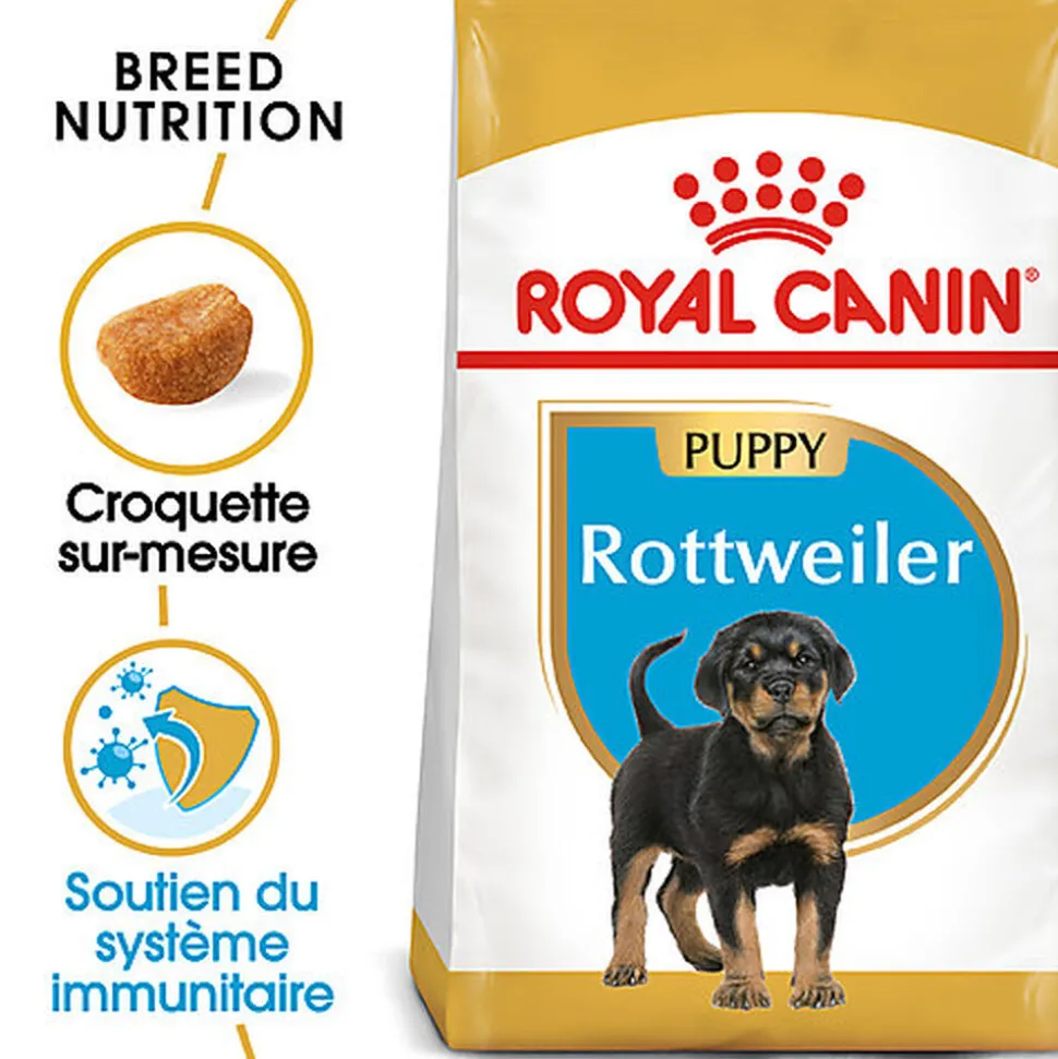ROYAL CANIN® Rottweiler Puppy est spécialement formulé pour répondre à tous les besoins nutritionnels de votre jeune Rottweiler et convient aux chiots de moins de 18 mois. Parce que le système immunitaire de votre chiot est encore immature, ROYAL CANIN® Rottweiler Puppy contient un complexe breveté d’antioxydants, dont de la vitamine E. Cette formule exclusive aide à renforcer les défenses naturelles de votre chiot au cours de cette phase clé de sa vie.