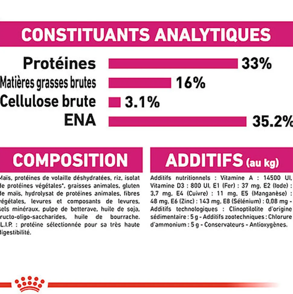 | Composition | COMPOSITION : Composition : maïs, protéines de volaille déshydratées, riz, isolat de protéines végétales*, graisses animales, gluten de maïs, hydrolysat de protéines animales, fibres végétales, levures et composants de levures, sels minéraux, pulpe de betterave, huile de soja, fructo-oligo-saccharides, huile de bourrache. L.I.P. : *L.I.P. : protéine sélectionnée pour sa très haute digestibilité. |
