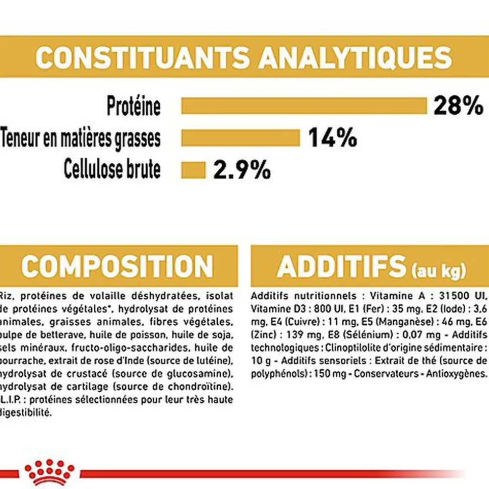 | Composition | COMPOSITION: Riz, protéines de volaille déshydratées, isolat de protéines végétales*, graisses animales, hydrolysat de protéines animales, fibres végétales, sels minéraux, pulpe de betterave, huile de poisson, huile de soja, fructo-oligo-saccharides, huile de bourrache, extrait de rose d’Inde (source de lutéine), hydrolysat de crustacé (source de glucosamine), extraits de thé vert et de raisins (sources de polyphénols), hydrolysat de cartilage (source de chondroïtine).ADDITIFS (par kg):Additifs nutritionnels : Vitamine A: 31500 UI, Vitamine D3: 800 UI, E1 (Fer): 47 mg, E2(Iode): 4,7 mg, E4 (Cuivre): 9 mg, E5 (Manganèse): 61 mg, E6 (Zinc): 183 mg, E8 (Sélénium): 0,1 mg – Additifs technologiques: Triphosphate pentasodique : 3,5 g – Conservateurs – Antioxygènes. – CONSTITUANTS ANALYTIQUES: Protéine:28% – Matières grasses: 14% – Cendres brutes: 6.4% – Cellulose brute: 2.9% – Par kg: Calcium:8 g – Phosphore: 6.6 g.*L.I.P.: Protéines sélectionnées pour leur très haute digestibilité |