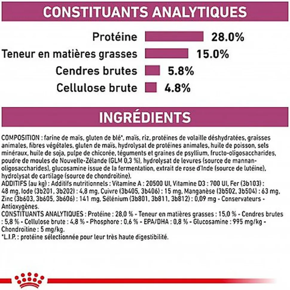 | Composition | Protéine 28 g, Matières grasses brutes 15 g, Glucides 34,4 g, ENA 41 g, Fibres totales 11,3 g, Fibres alimentaires brutes 4,7 g, Oméga 6 3,81 g, Oméga 3 1,2 g, EPA + DHA 0,73 g, Calcium 0,75 g, Phosphore 0,62 g, Green-Lipped Mussel (GLM) 0,3 g, L-carnitine 5 mg, Chondroïtine + Glucosamine 100 mg, Vitamine E 60 mg, Vitamine C 30 mg, Taurine 210 mg, Lutéine 0,5 mg, Energie métabolisable calculée 286 kcal |