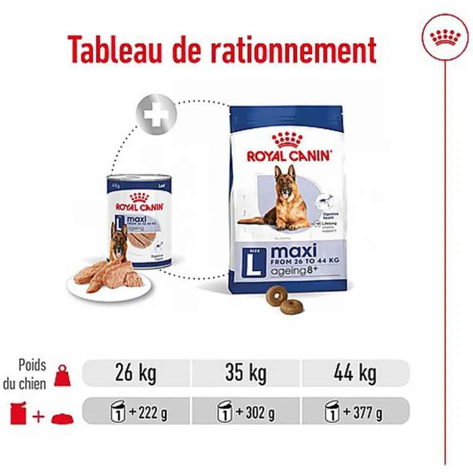 ROYAL CANIN® Maxi Ageing mousse est un aliment humide nutritionnellement complet et équilibré spécialement conçu pour répondre aux besoins spécifiques de votre chien de grande taille et le soutenir tout au long de sa vieillesse. Cet aliment convient aux chiens de grande taille pesant entre 26 et 44 kg et âgés de plus de 5 ans.