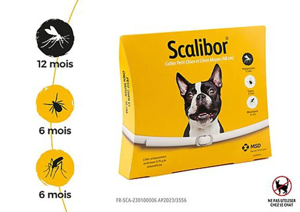 Ne pas utiliser chez le chien de moins de 7 semaines, chez la chienne gestante, chez le chat. Le collier Scalibor est un médicament vétérinaire. Tenez-le hors de portée des enfants et lavez-vous les mains après manipulation du collier. N’hésitez pas à consulter votre vétérinaire.
