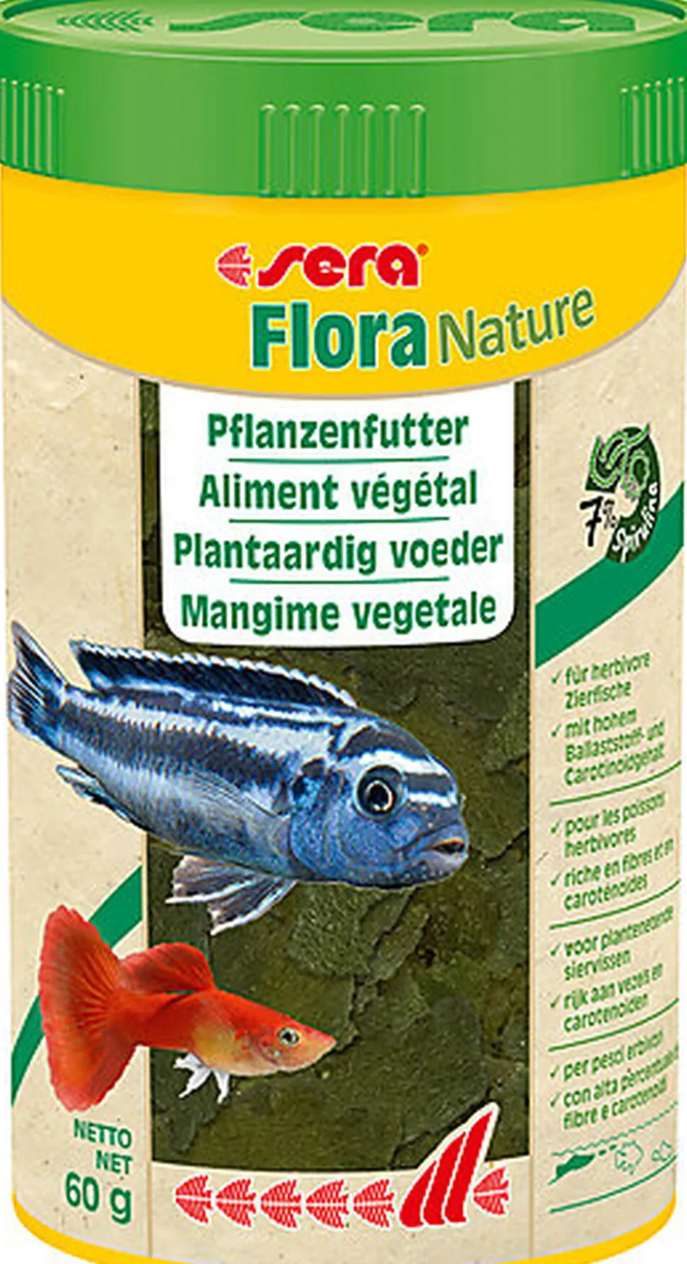 Sera Flora Nature est l’aliment végétal pour tous les poissons d’ornement herbivores mangeant en surface, qui ne contient aucun colorant ni conservateur.