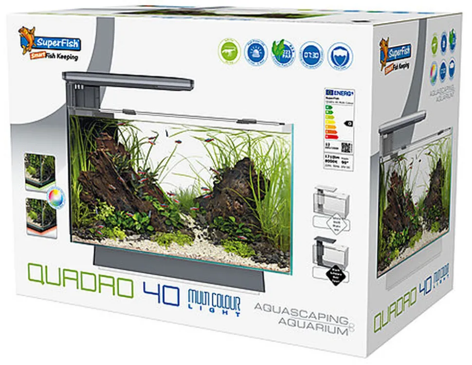 Le Superfish Quadro 40 est un aquarium au design contemporain, parfait pour ceux qui souhaitent un bel aquarium dans leur intérieur sans y consacrer trop de temps pour l’entretien. Compact avec une capacité de 28 litres (dimensions : 45 x 25 x 25 cm), il convient aussi bien aux poissons d’eau froide qu’aux poissons tropicaux grâce à un espace dédié pour l’installation sécurisée d’un chauffage optionnel, discrètement intégré.
