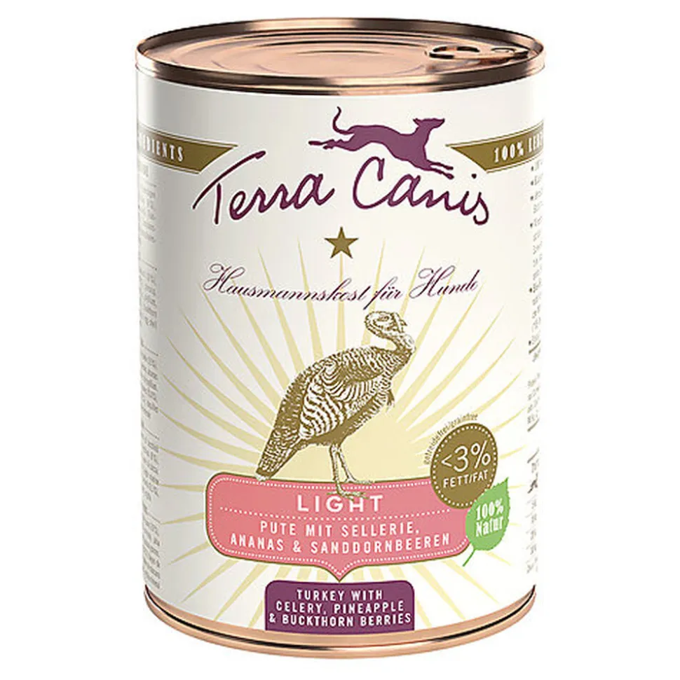 Avec seulement 3 à 4 % de matières grasses, les menus LIGHT de Terra Canis sont faibles en calories et en matières grasses. La part de viande réduite est compensée par une portion supplémentaire de légumes et de fruits. Il est renoncé aux céréales riches en calories. L’ajout d’ananas, de papaye et d’huile de pépins de raisin précieuse aide à stimuler le métabolisme des lipides. La farine de noix de coco et les feuilles d’artichaut soutiennent cela. Les matières fibreuses du psyllium procurent une meilleure sensation de satiété. Terra Canis LIGHT est particulièrement adapté pour les chiens souffrant de surpoids. Pour soutenir la perte de poids, nous recommandons de faire bouger le chien chaque jour et sur le long terme.