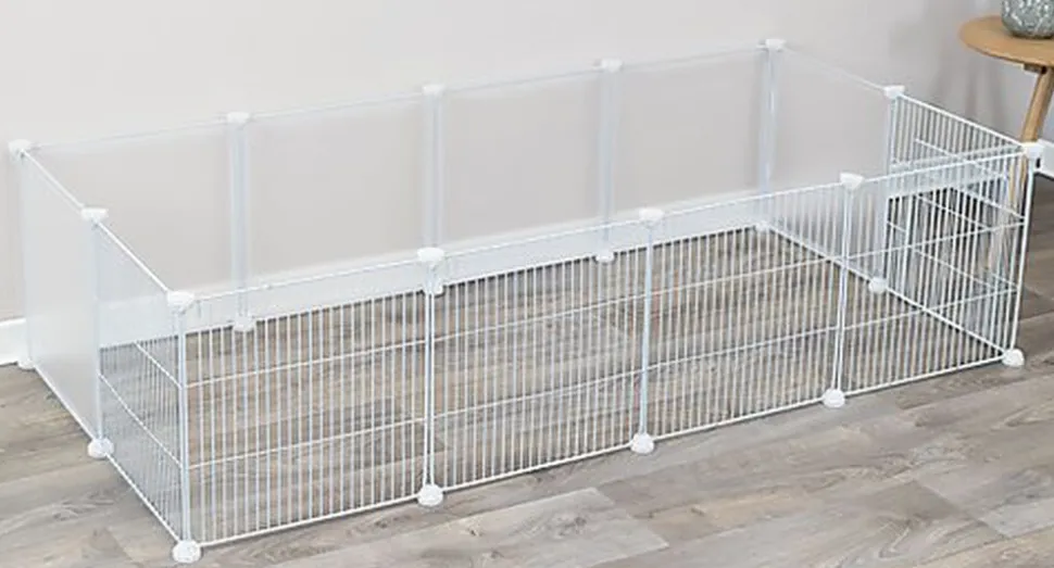 Enclos intérieur en métal et en plastique idéal pour les lapins et cochons d’inde, pouvant s’assembler et s’agrandir à volonté de plusieurs façons.