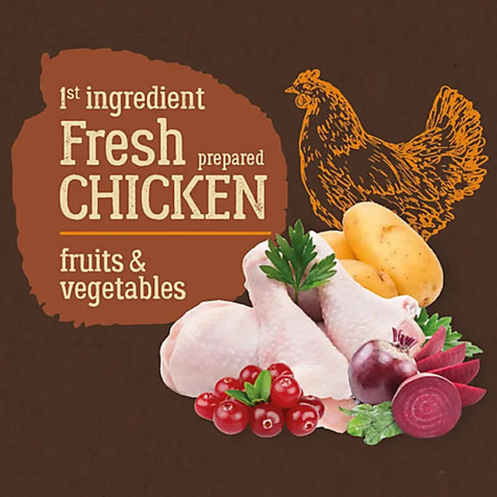 | Composition | Protéines de poulet déshydratées (30%), Poulet frais* (26%), Pomme de terre* (14%), Protéines de pois, Fibres végétales* (Fibre de canne à sucre (2%) Pulpe de betterave (1,5%)), Poudre d’oeuf* (4%), Graisse de volaille, Minéraux, Hydrolysées de protéines de volaille, Algues*Ascophyllum nodosum (1%), Pulpe de chicorée comme source FOS* (1%), Huile de saumon (0,5%), Paroi cellulaire de levure* (1,3&1,6 Bêta-glucanes et MOS prébiotique) (0,2610%), Canneberge * (0,1%), Mélange de plantes et d’extraits de plantes* (Rosmarinus sp., Curcuma sp., Citrus sp., Eugenia sp.) (0,04%), Yucca Schidigera* (0,027%). * Avec des ingrédients naturels |