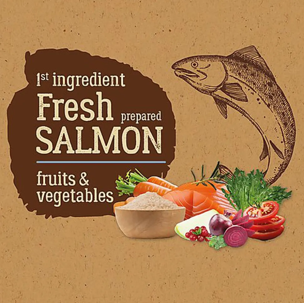 | Composition | Saumon frais* (26%), Maïs* (14%), Protéines de volaille déshydratées, Protéines animales déshydratées, Farine de gluten de maïs, Orge* (7%), Riz brun* (7%), Graisse de volaille (4%), Protéines animales hydrolysées, Fibres végétales* (Fibre de pois 1%), Minéraux, Pulpe de betterave* (1%), Pulpe de chicorée* (1%), Carottes déshydratées* (0,5%), Tomate déshydratée* (0,5%), Pomme déshydratée* (0,5%), Graines de lin* (0,5%), Farine de canneberge* (0,1%), Paroi cellulaire de levure* (Bêta-glucanes et MOS prébiotique) (0,061%), Yucca schidigera* (0,027 %). *Avec des ingrédients naturels |