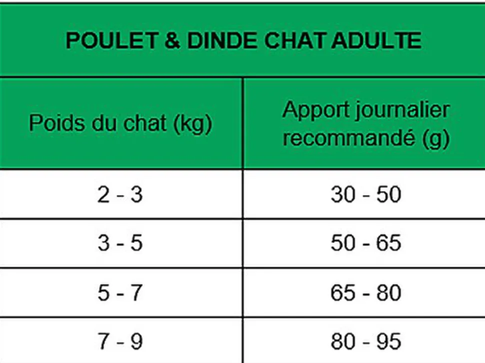 | Directives d’alimentation | Servir sec ou légèrement humidifié avec de l’eau tiède ou du bouillon. Veillez à ce que votre chat ait toujours de l’eau fraîche à disposition. La nourriture doit être disponible à volonté pendant la journée. La dose journalière recommandée est indiquée dans le tableau d’alimentation. Les besoins nutritionnels de votre chat peuvent varier en fonction de son âge, de son activité ou de son environnement. Eviter la suralimentation. |