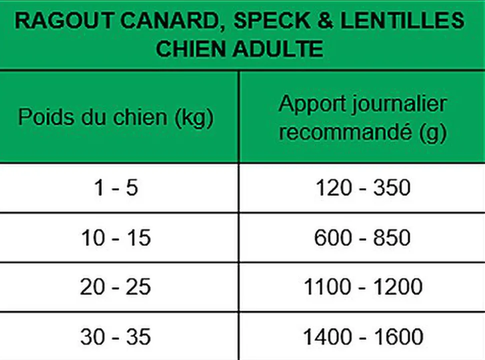 | Composition | Viande de canard 62%, speck 30%, lentilles 4%, minéraux, xylose. |
