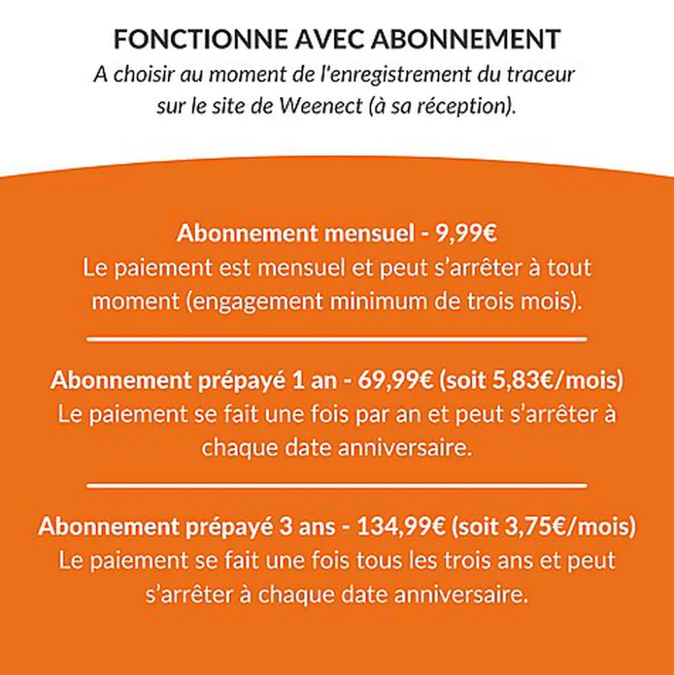 Cet abonnement se choisit au moment de l’enregistrement du traceur (à sa réception) sur le site de Weenect.