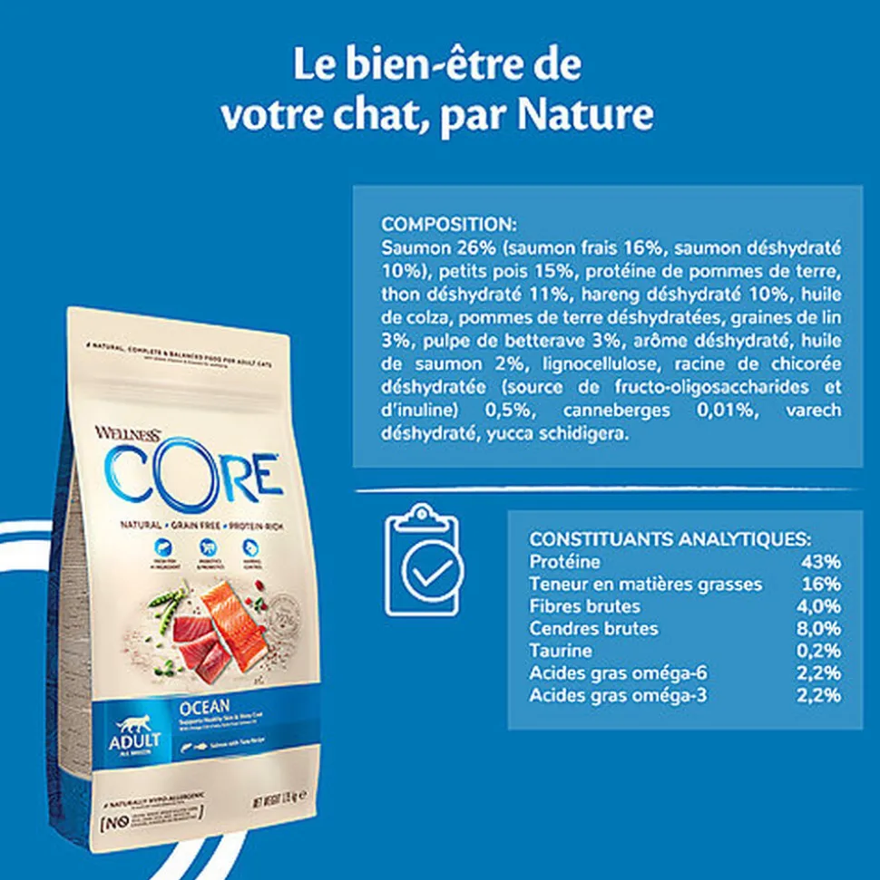 Les croquettes Wellness CORE Océan Saumon et Thon sont complètes et équilibrées pour les chats adultes. Leur composition se rapproche du régime alimentaire naturel des chats : elles sont sans céréales, riches en protéines, pauvres en glucides et elles contiennent du poisson frais.