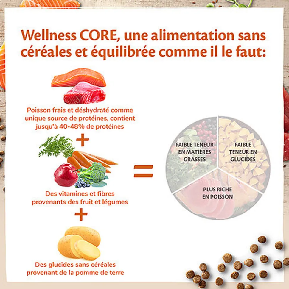 | Plus produit | La différence Wellness CORE réside dans le fait que nos recettes sèches ont toujours pour ingrédient principal de la viande ou du poisson frais. Ce sont des concentrés de protéines avec des niveaux de protéine garantis entre 38 et 44 % |