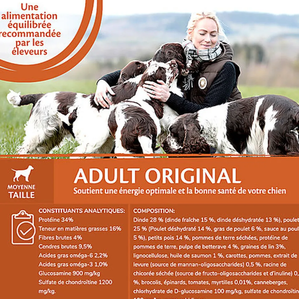 | Additifs nutritionnels | ADDITIFS NUTRITIONNELS (PAR KG): Vitamine A 14 000 UI, vitamine D3 850 UI, vitamine E 120 mg, sulfate de zinc, monohydraté 125 mg, sulfate ferreux, monohydraté 100 mg, sulfate de cuivre, pentahydraté 10 mg, oxyde manganeux 3 mg, iodate de calcium, anhydre 1 mg, sélénite de sodium 0,2 mg. ADDITIFS TECHNIQUES (PAR KG): Enterococcus faeclium NCIMB 4b1705, 109 cfu – Permet de stabiliser, maintenir et restaurer l’équilibre bactérien du transit intestinal des chiens |